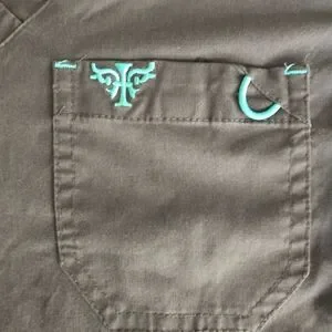 Comfortable Med Couture scrub top with a V-neck design. Features multiple pockets for convenience.