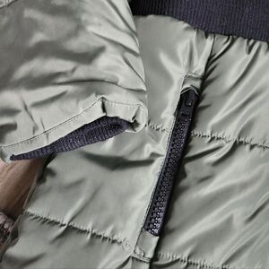 Stylish green puffer coat with a cozy hood. Features black trim and a warm interior.