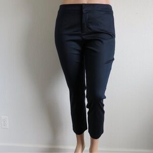 These beautiful ankle trouser pants feature a rich navy blue color fabric. Front slack pockets with faux back pockets. Hook/eye and zip closure. Stretchy fabric for a comfortable fit!
