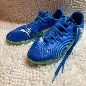 Bold royal blue shoes with sleek design. Iconic Puma branding. Indoor soccer cleats size 2 boys
