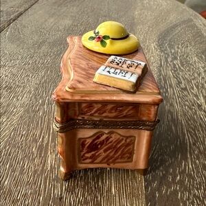 Limoges France Peint Main porcelain Trinket Box Chest from France. Cute with a hat and open book on the top of the chest. Painted dress shirts inside, shell clam shape clasp.