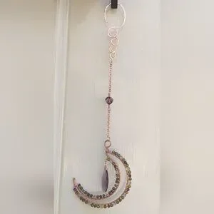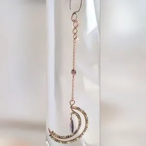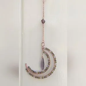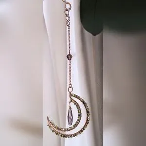 Hand Made Renaissance Art Nouveau Inspired Copper Moon Sun Catcher Ornament. Featuring Vintage Swarovski Crystals And A Faceted Purple Glass Drop Accent.