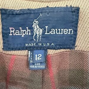 Classic Ralph Lauren Vintage Wool Full Length Coat. Features Single Breasted - Plaid Lining - Double Button Cuff - Button Front with Plaid Placket - Back Slit (Button Missing) - Plaid Lined Pockets - Lightly padded shoulders. This coat is heavy and warm. Made in USA. Size 12 buttons are on the Right - Button Holds on Left. small spots on shoulder and side noted in photo.