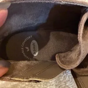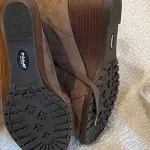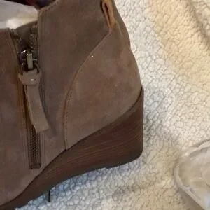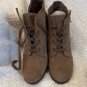 New without tags never worn these are more of a brownish toe color. Has that suede feel to it. Zipper on inside ankles lace up front nice wedge with a good grip. Bottom size is 8 1/2.