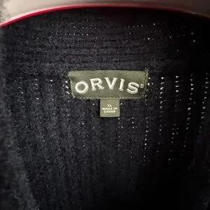 Vintage ORVIS Chunky Knit Men’s XL Navy Blue Wool Cardigan Sweater with Shawl Neckline and Elbow Patch.
