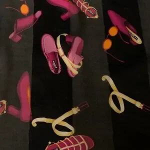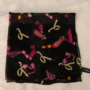 Adorable vintage small neck, wrist or purse scarf by Kenneth Cole. Black background with pinks and yellows women’s accessories (shoes, belts, sunglasses) as design. It can also be worn as as ponytail bow.