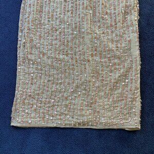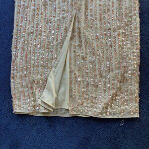 Elegant vertical-sequined midi sheath dress with a flattering hand-beaded waist and back vent slit, perfect for adding sophistication to any occasion.