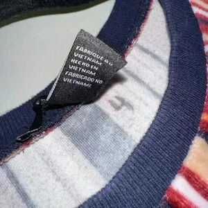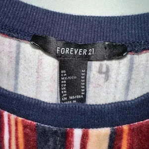 This is a pre-owned Forever 21 women's long-sleeve, striped velour sweater. It is a size medium and features a crew neck, long sleeves, and a ribbed hem and cuffs. The sweater is made of a soft, comfortable velour fabric and is in good condition. There are no visible stains or tears. The sweater is approximately 23 inches long and 18 inches wide. The colors are red, white, blue, and tan. The sweater is made in Vietnam.