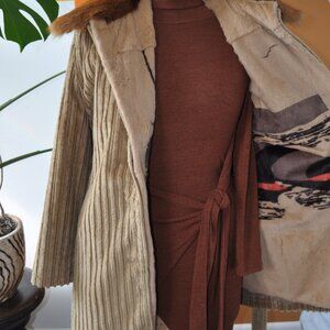 This is a one of a kind 2 in 1 rabbit lined corduroy jacket with fox trim. This jacket is a statement piece with very vintage/ bohemian vibes. Purchased for $900 originally. This will be the cutest vintage piece you own!