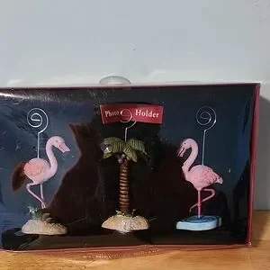 sorry, the box got something crunched one side but there is no damage to the product two flamingo and palm tree picture holders
