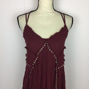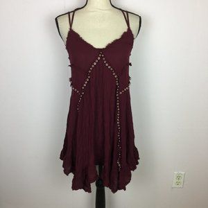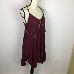 Free People Slip Dress Sz M Red Burgundy Trapeze V-Neck Studded Cross Ba…
