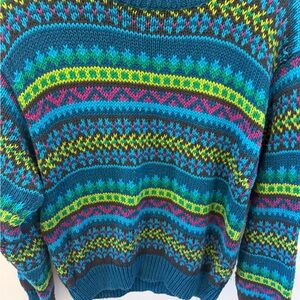 Brighten your look with this vintage Jantzen sweater. Features vibrant stripes in blue, green, and pink. Perfect for any casual outing.