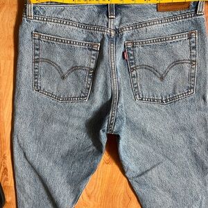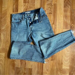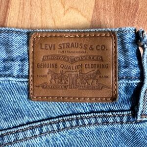 Levi's jeans in classic blue. Features a brown leather patch with logo detail. Raw hem, has self fringe. Button fly. Approximate measurements laid flat waist 14”, rise 10.5”, length 26” (not including fringe)