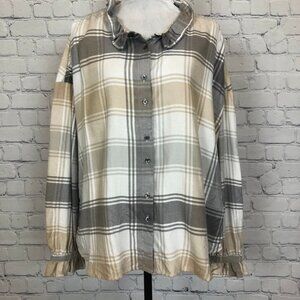 Tan, gray, and white plaid loose-fitting buttondown shirt in a soft viscose blend. Features a ruffled neckline, ruffled sleeve openings, smocking detail at the shoulders, and drop shoulder sleeves. Color may show lighter in person than in the photos.