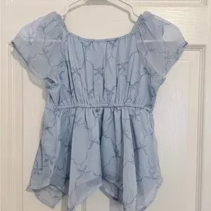 Charming light blue blouse with delicate bow patterns. Chiffon babydoll top. Super adorable! Size 11/12