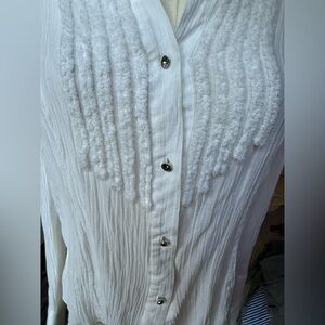 • Pleated or ruffled bib front — reminiscent of men’s vintage tuxedo shirts, but softened with texture and frayed detailing for a feminine touch.
