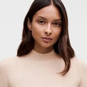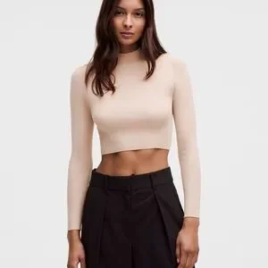 This Lululemon Athletica crop top features a snug, form-fitting design in a soft pink hue. The bodysuit style offers a sleek silhouette with long sleeves and a high neckline, perfect for a minimalist and chic look.