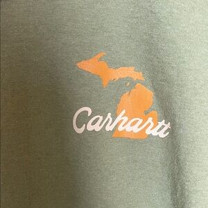 Olive green Carhartt shirt featuring bold orange logo on chest and sleeve. Comfortable long sleeves.