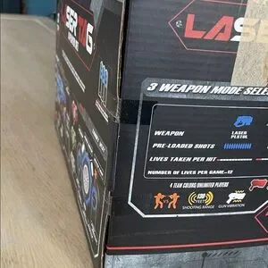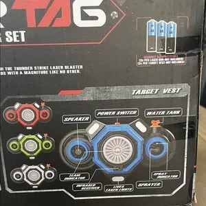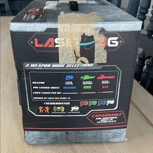 Sealed in box never opened- Laser Tag set with 4 blasters and vests. Blasters make sounds and vibrate when hit. Three weapon modes and four team colors. 130’ shooting range. Very cool gift
