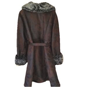 The coat features a rich, distressed brown material faux shearling with a plush faux fur collar and cuffs in a stylish grey/black /brown mix. The mid-length cut and the matching tie-belt create a flattering silhouette that can be adjusted for a perfect fit.