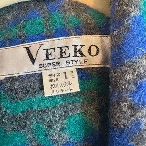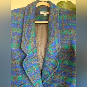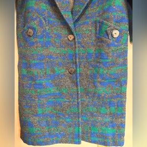 Amazing vintage made in Japan coat! Fun colours and pattern with unique angular pockets and button. Unsure of composition. Structured shoulders and fantastic collar!