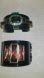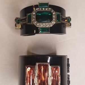 Elegant black cuff bracelet featuring green and orange gemstones with gold accents. A second black metal cuff bracelet.