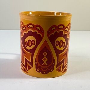 Vibrant 1970s ceramic mug designed for Staffordshire Potteries Ltd. and signed “Simone Mirman” on the base. Glossy glaze with bold psychedelic flower-power graphics and a comfortable squared handle. Classic English retro form that works for coffee, tea, or display in a mod kitchen. Made in England. Light shelf wear on the base consistent with age; overall well-kept with no cracks. Small dark spot on inside that’s part of the glaze. See last photo. Holds approximately 10 oz of water. Original manufacturer capacity not found as it is vintage.