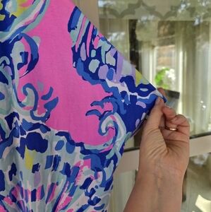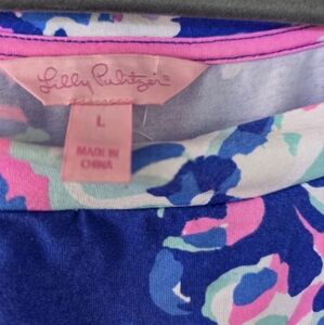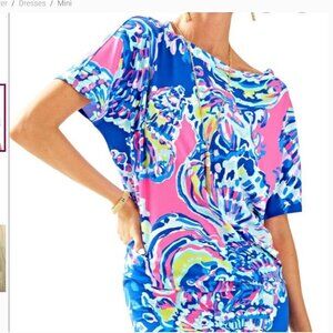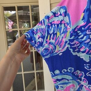 This Lilly Pulitzer dress is a must-have for those who love floral patterns and dolman sleeves. The boat neckline and pullover closure make it easy to wear, while the short length makes it perfect for summer, fall, or spring. It comes in size L and is made of 93% rayon and 7% spandex, ensuring both comfort and durability.