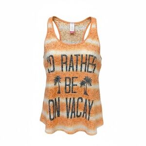Striped muscle tee with palm tree graphic. Comfortable and casual style. Perfect for vacations.