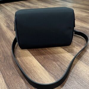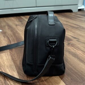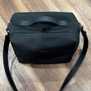 Mina Baie Luca Lunch Bag. Sleek and chic. Made of nylon and the inside lining is neoprene. Top handle and strap are Napa leather. Features an extra wide opening and 4 interior mesh pockets and 3 utensil elastic loops. Top handle or non adjustable cross body strap (strap can be removed). Also doubles as a breast pump bag, with enough space to carry all breast pump parts and bottles for pumping moms on the go. Like new, excellent condition. Original tags and dust bag not included.