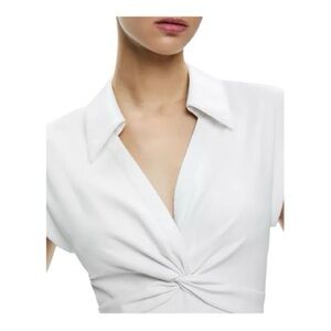 Chic white mini dress with a twist front. Cap sleeves and tiered skirt. Perfect for stylish outings.