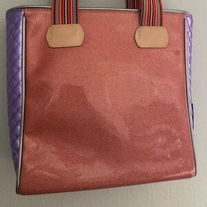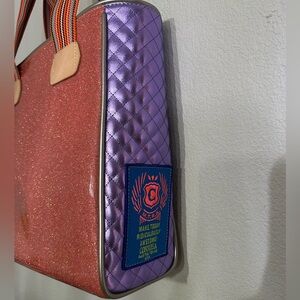 She’s a special one! Bronze/Burnt Orange glitter with purple metallic quilted side panels with breathtaking embroidery patch splashed across the front panel! You will be turning heads as you walk down the street! It takes a special lady to carry this one, is that you?