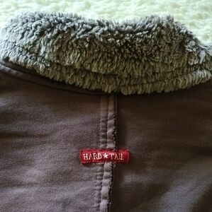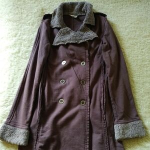 Vintage 00s Hard Tail Forever knit jersey trench coat in eggplant. Double-breasted. Pockets. Fleece fur trimmed collar and cuffs. Raw edge hems. Metal buttons. Lightweight. 100% cotton. Excellent condition. Size tag Medium but fits small.