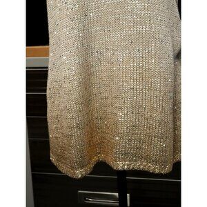 Beautiful sweater set in good pre-owned condition. Please note that the cardigan is size 3 and the tank is size 2. They are a beige color with gold dip dye ombre. They have translucent sequins scattered all over. The cardigan is 27.5" long from shoulder to bottom hem. The tank measures flat across: chest (pit to pit) - 18" and bottom hem width 21". Total shoulder to hem length is 26". It has a lot of stretch. Please see photos.