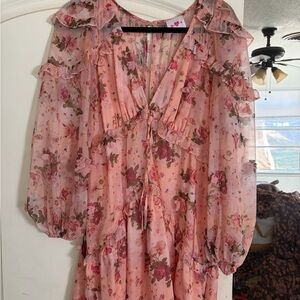Elegant pink maxi dress with floral pattern. Features long sleeves and a flowing silhouette. Perfect for any occasion.