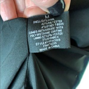 Faux leather sleeves with zipper hem, double zip up middle, and zippered pockets. Faux leather trim and top right zippered pocket.