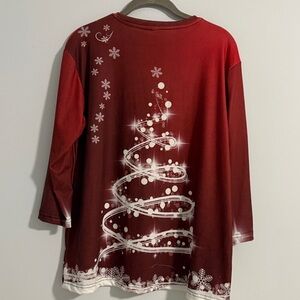 Celebrate the season with this festive red top featuring a whimsical Christmas tree design. On front and back. Perfect for holiday gatherings and adding a touch of cheer to your wardrobe. 3/4 sleeve, rounded neckline. Lightweight. Brand tag,Care tag not included.