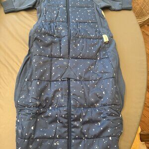 Organic cotton sleep suit bag, award-winning design, keeps a child warm with no need for blankets. Stretchy sides, foldover mitts, four-way zip. Separates legs for comfort and movement. Safe way to keep baby warm without the need for blankets during sleep. Converts from traditional sleeping bag to a sleep suit with legs. Color is Blue. Sizing 3-12 months. 2.5 TOG. suited for room temperatures between 61-71°F. Smoke-free home. Brand new.
