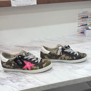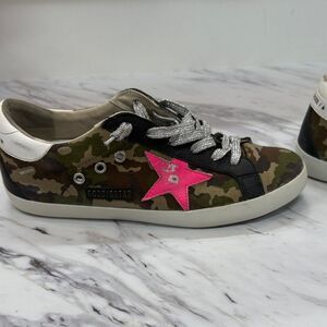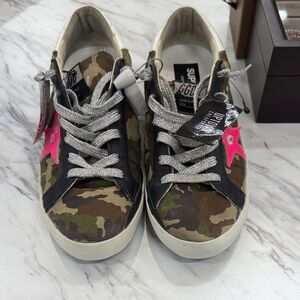 Camo pattern with a bold pink star. Lace-up design. Comfortable and stylish.