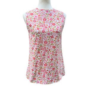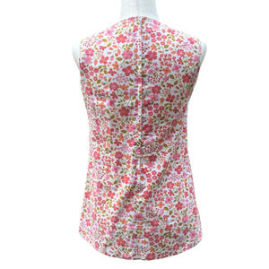 Adorable vintage handmade sleeveless tunic top in a vibrant retro floral print. Featuring shades of pink, coral, and olive on a crisp white base, this 1960s-inspired mod piece has a high neckline and a back zip closure. Perfect for layering with denim, styling under overalls, or pairing with flared pants for a groovy spring/summer vibe. Lightweight linen or cotton blend (no content tag).