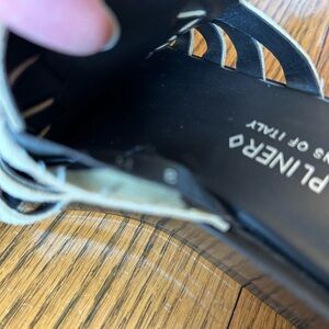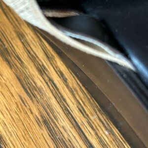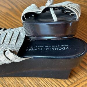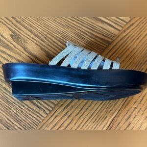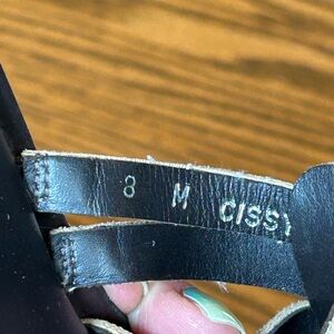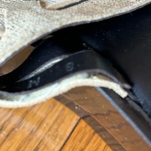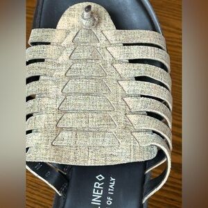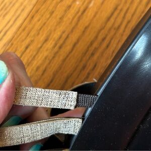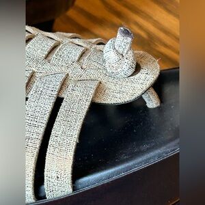 Elegant sandals with a woven cream upper that appears tan however it does have a metallic gold/bronze hue to it. Clean shoe with little wear on the bottom. Has a 2 1/2 inch heel hand has some stretch with the first two straps there is some minimal separation on the top of foot weaving as shown in the pictures, but could be fixed easily.