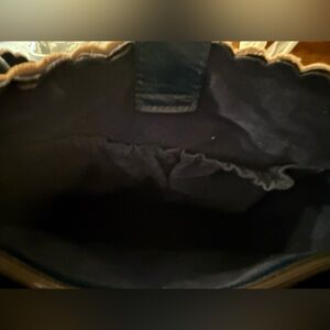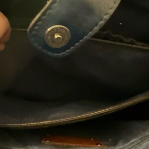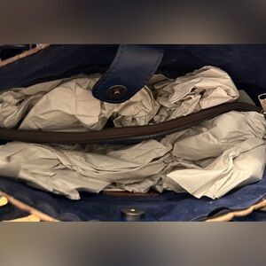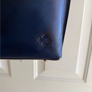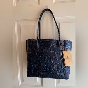 This stylish navy blue tote bag features intricate embossed detailing, perfect for adding a touch of elegance to any outfit. Ideal for daily use, it combines fashion with functionality. 11”H X 14”W X 5”