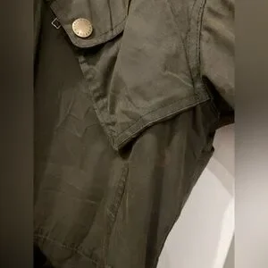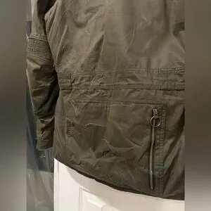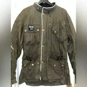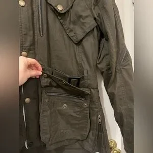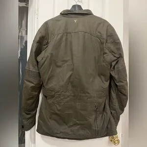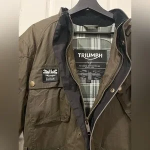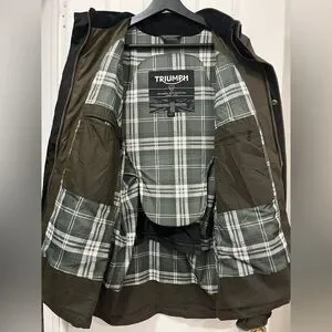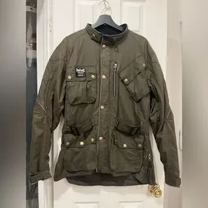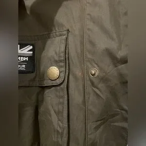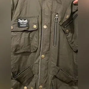 Triumph Motorcycles Barbour International Original Waxed Cotton Jacket with spine pad. Can remove the spine pad if wearing for fashion over function. Rugged olive jacket with multiple pockets. Features durable buttons and zippers, flash seams for riding, pocket on back. All pockets have zips and buttons.