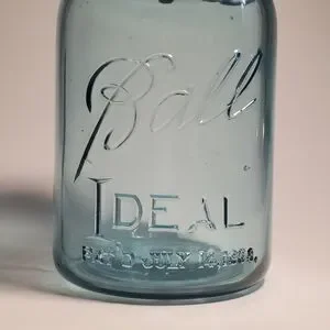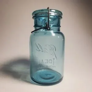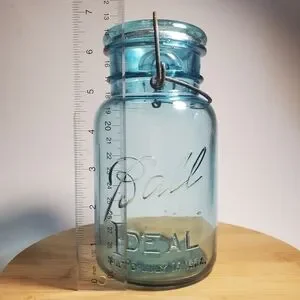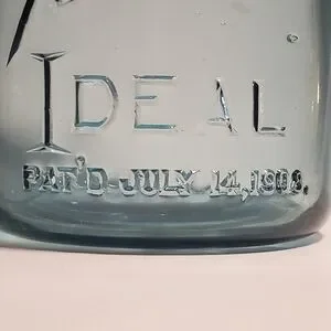 This vintage Ball Mason Ideal canning jar patented July 14th 1908 with bail wire closure and light clear glass lid jar is a beautiful aqua blue.. It was produced in mold #4 and has a backwards 9 on the neck.