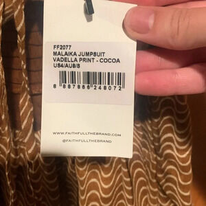 NWT Faithful the Brand Malaika jumpsuit with tie neck halter design, cut out at chest and swirl design all over. Stock photo added for reference from the website.