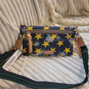 Vibrant crossbody with star pattern. Features colorful design and adjustable strap.