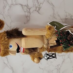 This festive wood nutcracker brings classic holiday charm with a rustic twist. Dressed in a red Santa-style hat trimmed in faux fur, he holds a black lantern in one hand and a burlap sack in the other, filled with a miniature Christmas tree accented by greenery and red berries. His coat features soft brown faux fur at the collar, cuffs, and hem, adding cozy texture to his traditional look. With bright blue eyes, a bold mustache, and a sturdy wooden base, he’s a timeless piece perfect for seasonal decorating or gifting.
