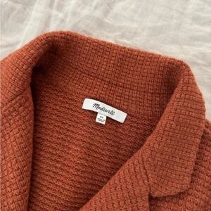 Madewell's description: A favorite in a textural stitch, with its sharp lapels and easy fit, this cozy cardigan has the look of a perfectly slouchy blazer. Relaxed, slightly oversized fit. Merino wool blend.