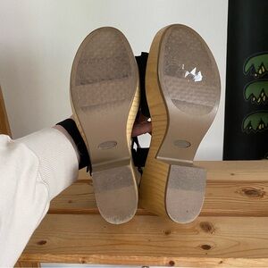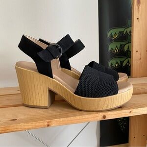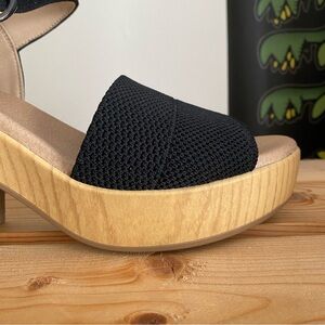 Awesome women’s Dr. Scholl's Black Brickell Leather Eco Knit Faux Wood Heeled Platform Sandal. These are so comfy you really can't believe they're heeled platforms! Dinners out, beach weddings, summer shopping days- you'll stay comfy and stylish all day long on these.