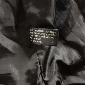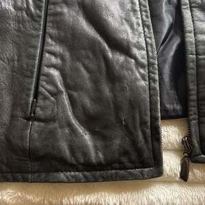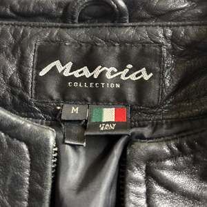 Stylish Marcia Collection black leather jacket, size M, in great used condition. This chic piece features a fashionable collarless design with subtle ruffled detailing, adding a touch of elegance to any outfit. A versatile outerwear option for both casual and dressy occasions. A few flaws in pic